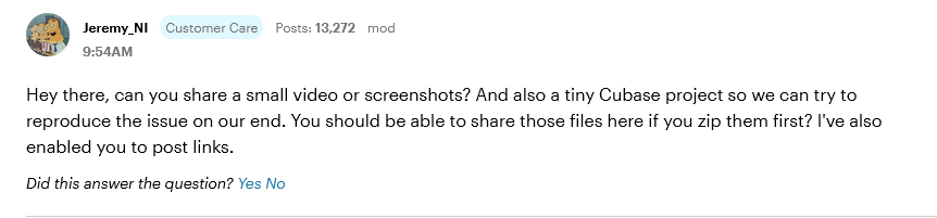 What’s really disappointing, though, is the stark difference between this support forum and the Cubase support forum. Please don’t get mad, Steinberg folks. I’ve always had a soft spot for you. I keep buying Cubase even though I hardly use it (in fact, I made zero music with Cubase 13 last year). But when it comes to support and customer care, there’s clearly room for improvement compared to this forum.