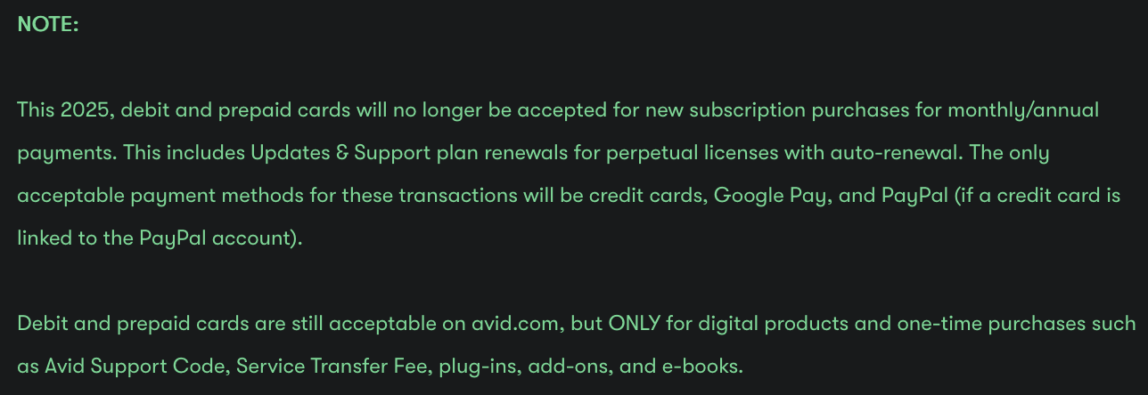 Get this: AVID is no longer accepting debit card payments for monthly or annual subscriptions, including Sibelius, of course!