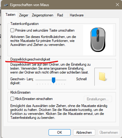 Man kann auch die Doppelklickgeschwindigkeit einstellen auf Windows (hier für Windows 11): Einstellungen/Bluetooth und Geräte/Maus/Verwandte Einstellungen > Zusätzliche Mauseinstellungen