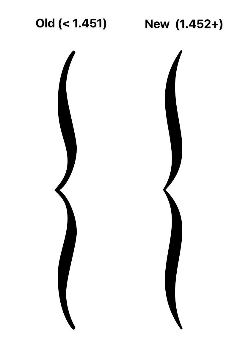 I have also noticed this - to me unwelcome - change in the brace design. However, I don’t think there’s any need to mess around with fonts. Go to Engraving Options/Brackets and Braces and under Advanced Options change the value for Regular brace to a much lower number.