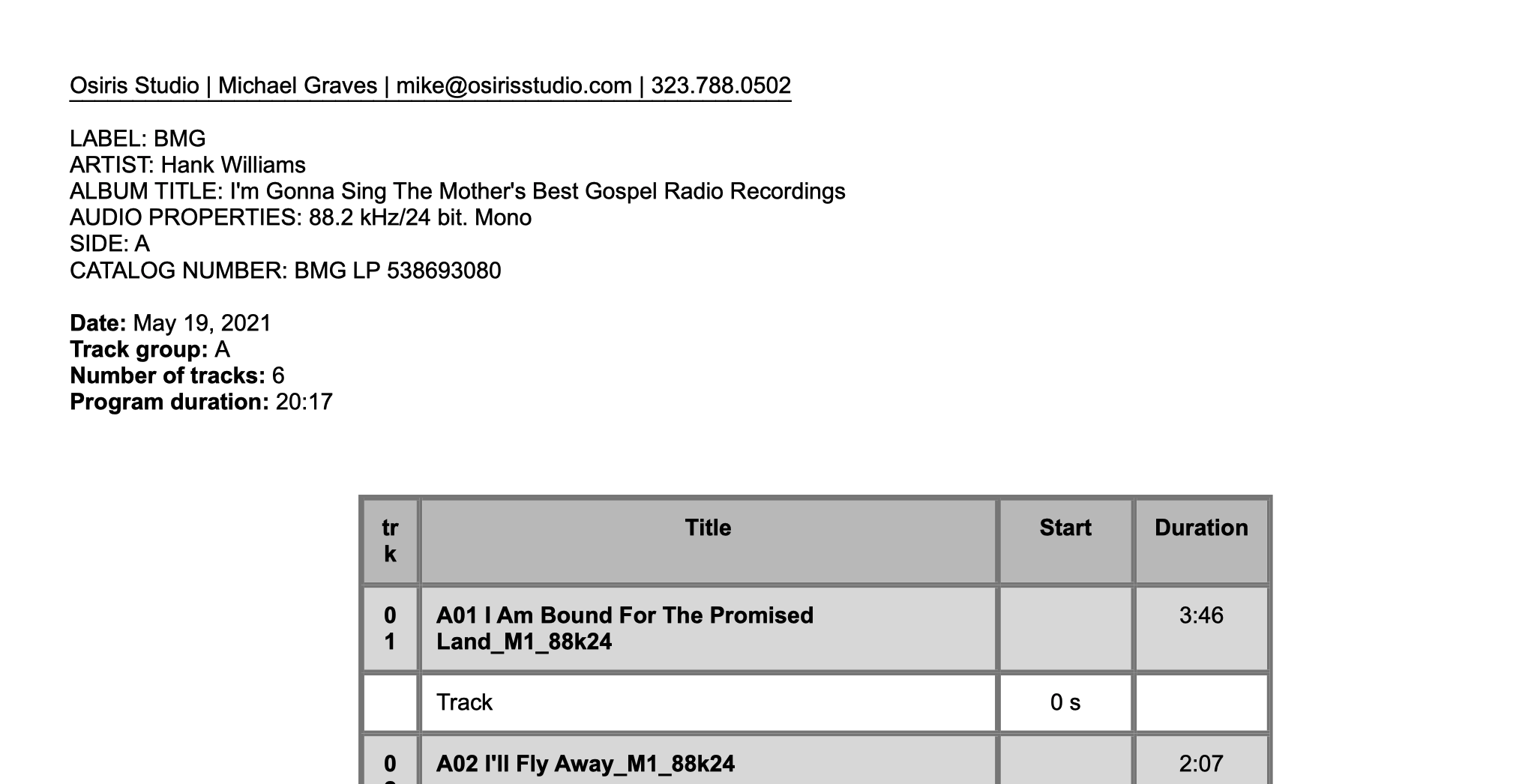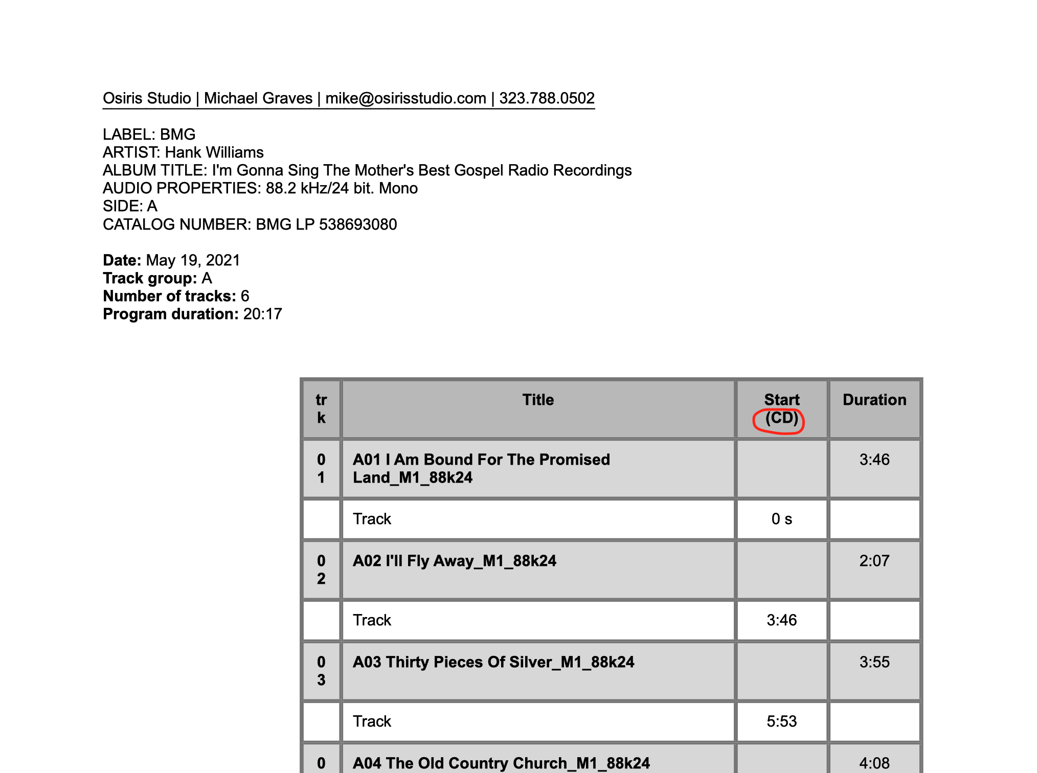 The Audio CD Report is very customizable. Here’s the settings I use to produce a vinyl report (one for each side using CD Track Groups), and the resulting PDF.