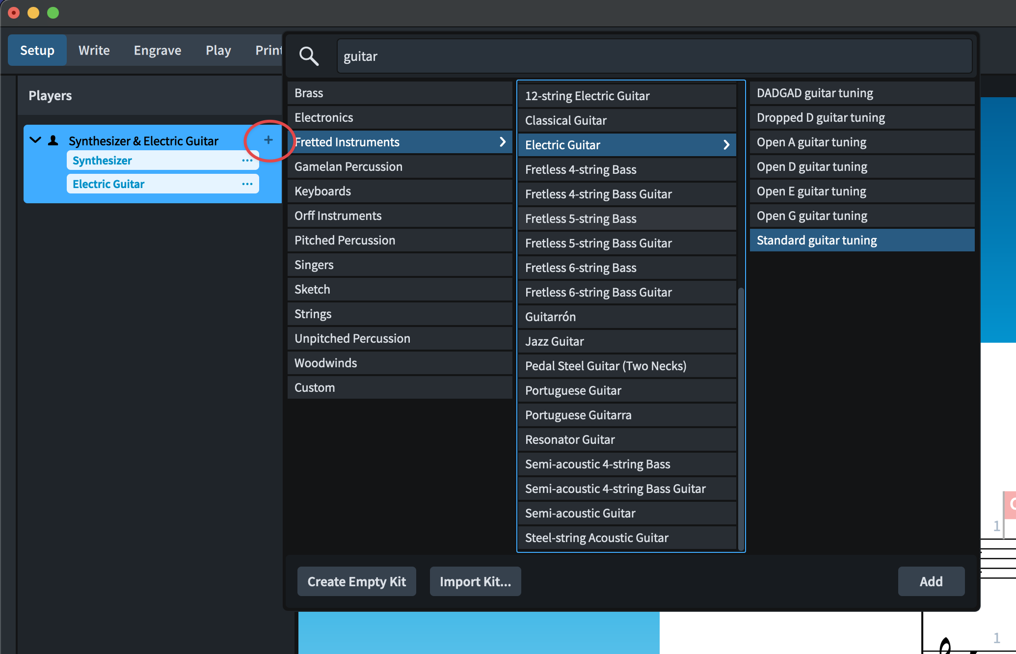 Did you try to add the guitar instrument to the synth Player (instead of just changing it), clicking on the little + in the Player blue box .