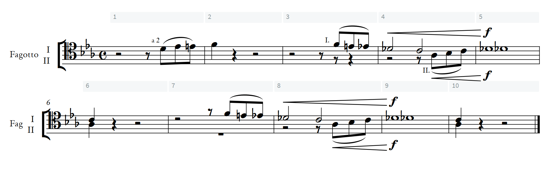 Why are the results in bars 3 and 7 different? Because at the end of the phrase before bar 3, both bassoons are playing and sharing a stem, but at the end of the last phrase before bar 7, the bassoons are not sharing a stem. If you add a condensing change at the start of bar 6, select the bassoon pair in the left column and click OK, the quarter notes in bar 6 will share a stem and bar 7 will look like bar 3, which is just the opposite of what you want.