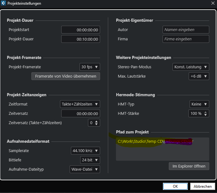 Wenn ich im ersten Cubase Fenster “leeres erzeugen” klicke, steht der “Standard Speicherort” und das Projekt Fenster bereits fest. Man muss also hier den Speicherort zuvor eingeben, da man später nicht mehr danach gefragt wird. In Cubase 5 war das anders. Da wurde musste man beim ersten Speichern des Projekts den Speicherort eingeben.
