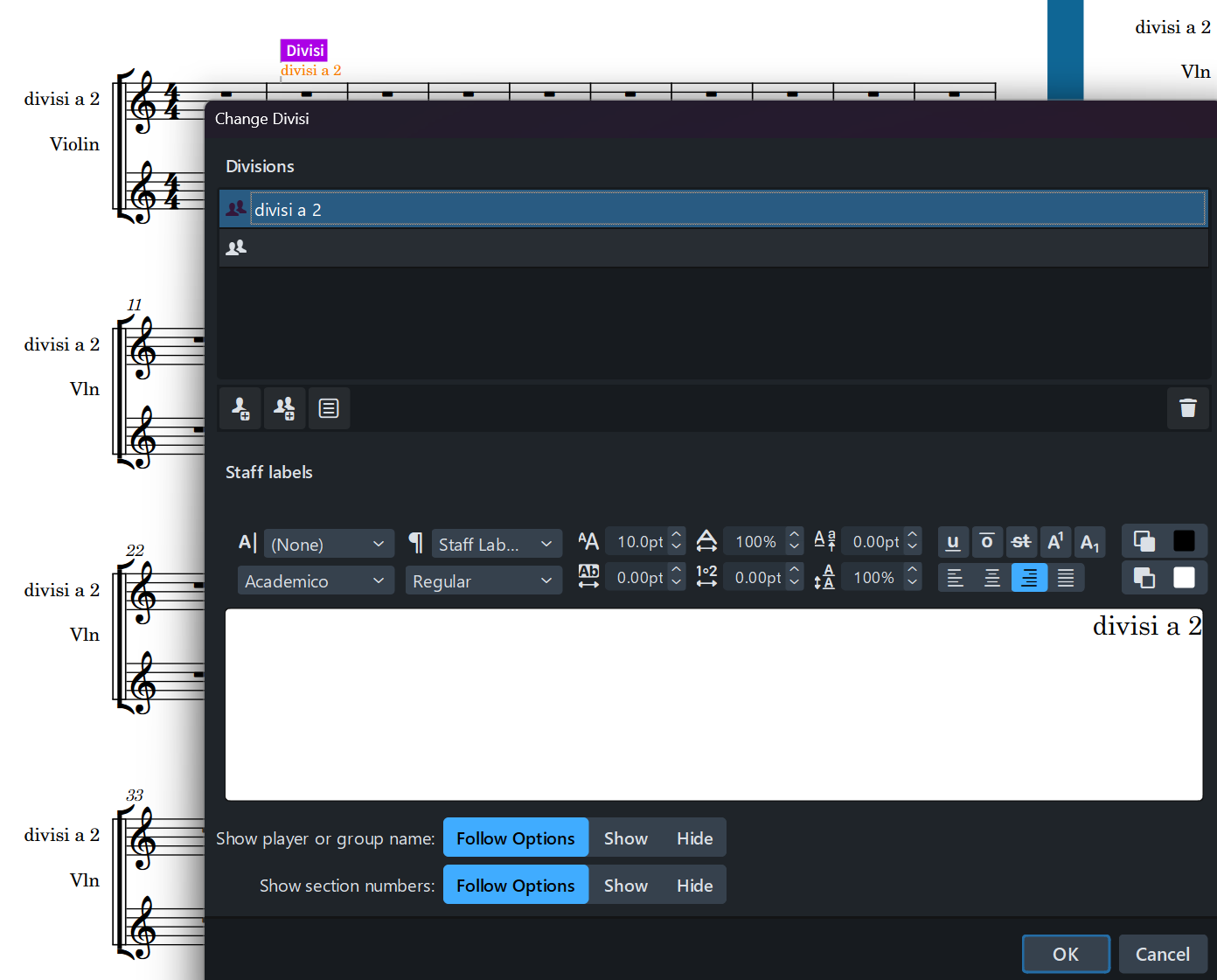 A couple of questions related to entering “divisi” for string orchestra: