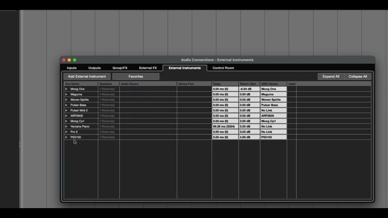 I added each external instrument in the Studio > Audio Connections > External Instruments panel, associating it with the relevent MIDI device previously created.