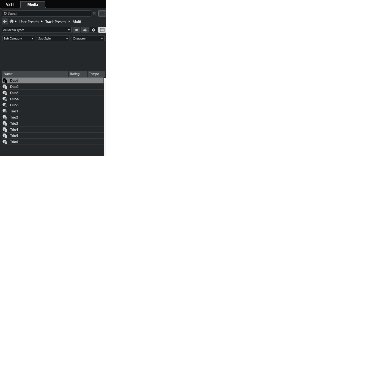 I’ve created 5 duo and 6 trio instruments, which are saved (right mouse on the selected tracks of a multi instrument and Save Track Preset) to Media/User Presets/Track Presets/Multi (Multi.png).