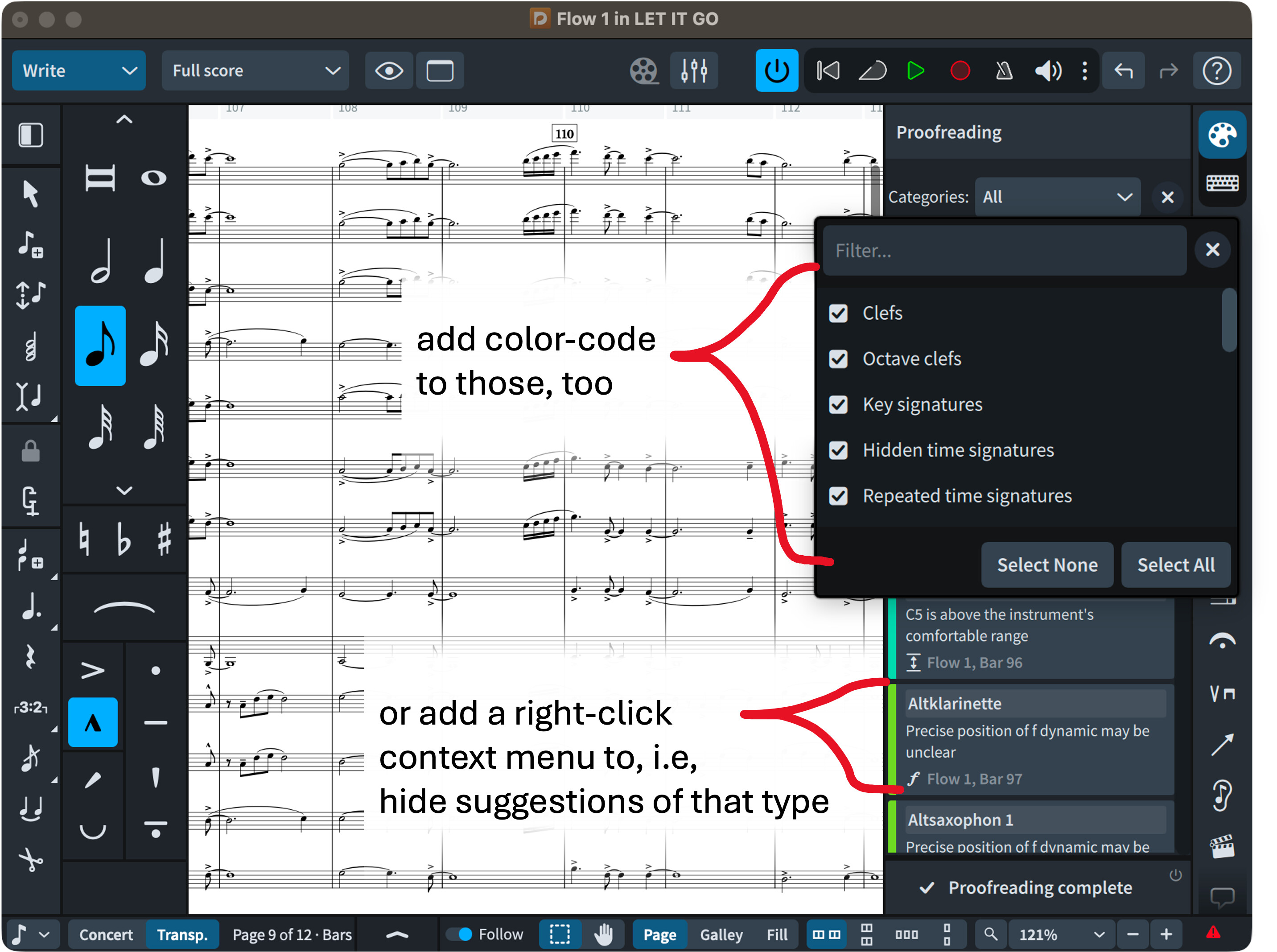 I’m going through an older score of mine, trying to incorporate many of the helpful suggestions that the Dorico 6’s proofreader gives me. There are two things that I’d like to see added: