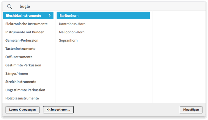However, there is still a “Baritonhorn” that is transposed in G (i. e. the “Bugle”) and the “Bariton” that is there in Dorico produces what is effectively a “Tenorhorn” in German. At least it now also shows the parent category for each instrument, so that, if you type “Bariton” into the search field, you see that one Bariton belongs to the singer category and the other belongs to the brass instrument category.