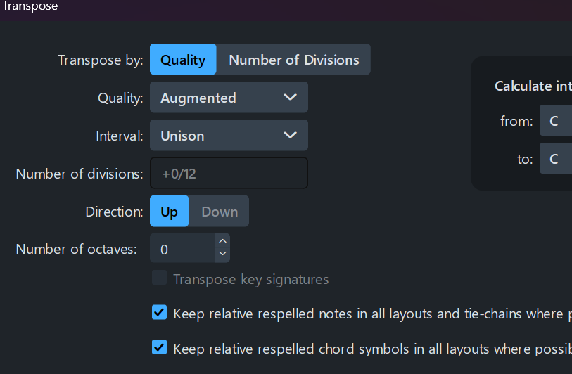 - Transposed up by a semitone (I couldn’t select “Change Key Signature” — not sure what its purpose is if it doesn’t adjust from F minor to F# minor).