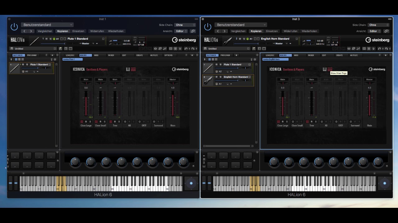 Iconica flute section meets english horn - using only the “close large“ microphone signals from both instruments, the flutes section is positioned slightly to the left, the english horn to the right - using 2CAudio’s Precedence, each track also has it’s dedicated reverb (Breeze 2 with P-Link activated). Dynamic expression played with the modulation wheel.