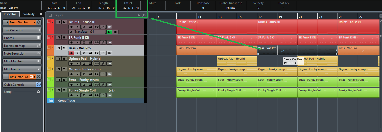 I have a project and some of the tracks are showing an Offset on the Info Line. The part lengths are correct (eight bars) and begin and end on the correct measures, but show an offset of -3.3.1.45 on some tracks, and, there are similar but not identical Offset numbers on some other tracks (see screenshot of one track’s “offset”).