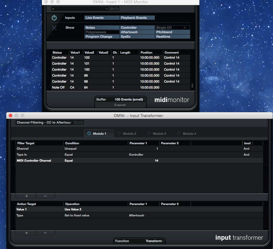 I’m attempting to make CC14 messages from my controller (Kenton Control Freak) trigger Aftertouch.