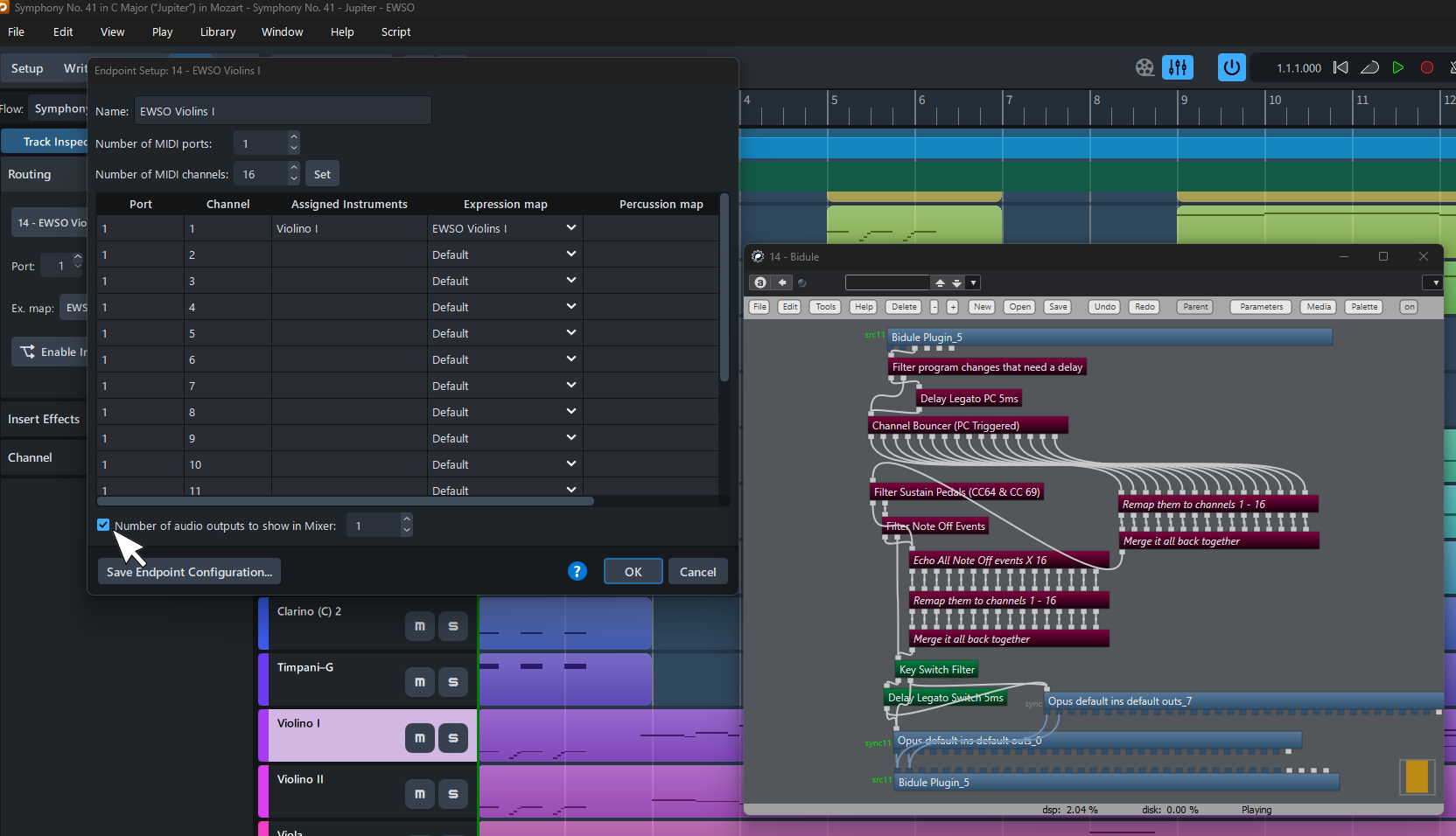 Dorico automatically registers all the busses with plugins and puts them on the mixer. Bidule opens with the 32 audio output pins exposed right away. If only using a single stereo output, the user gets an option to manually hide excess/unused busses from the Dorico mixer in endpoint settings: