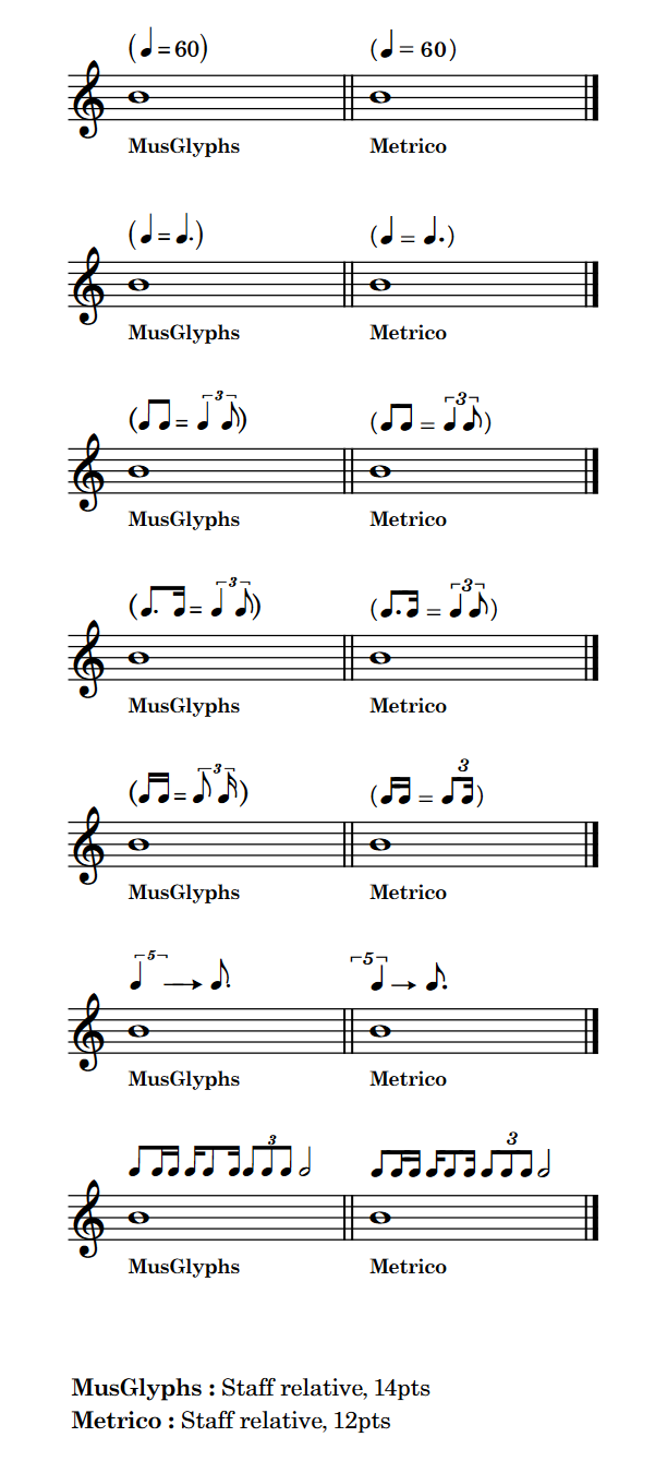 (from the left: metrico, glyphs from Dorico (short flags), Dorico default metric modulation)