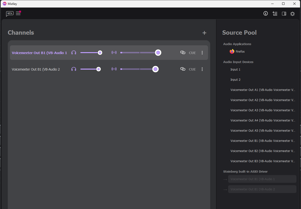 I just tried to test mixkey on my PC, and I’m a bit disapointed , for example I thought it was possible to affect an ASIO output from Cubase to have a loopback for the streaming but it’s not the case, I have only firefox in the list of applications and Voicememeeter’s I/O but I want to remove voicemeeter to be replaced by mixkey !!!