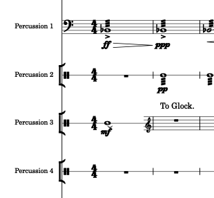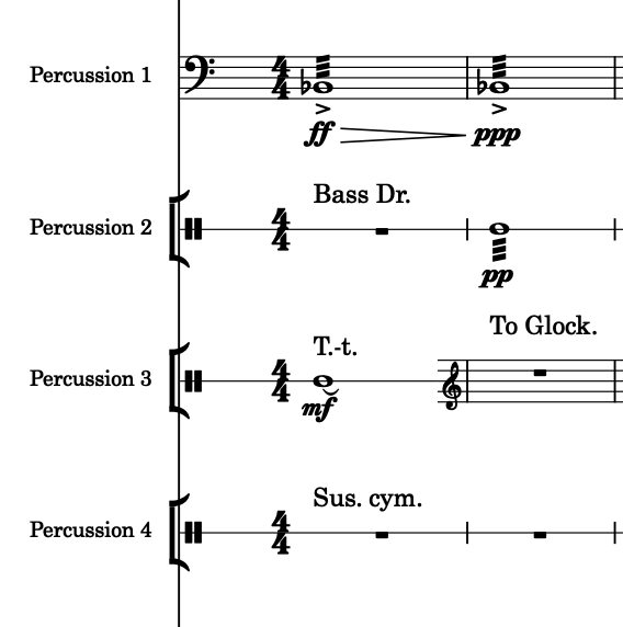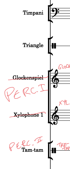 And I still don´t know how to show, in the general score, wich is the first instrument that each percussionist plays: