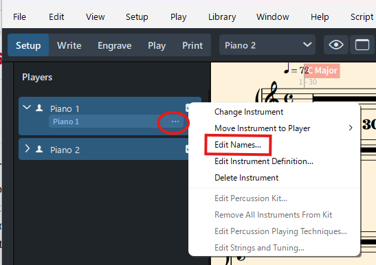 Open the Player tab to show the instrument and click the … (circled) to open the sub-menu. Then select Edit Names