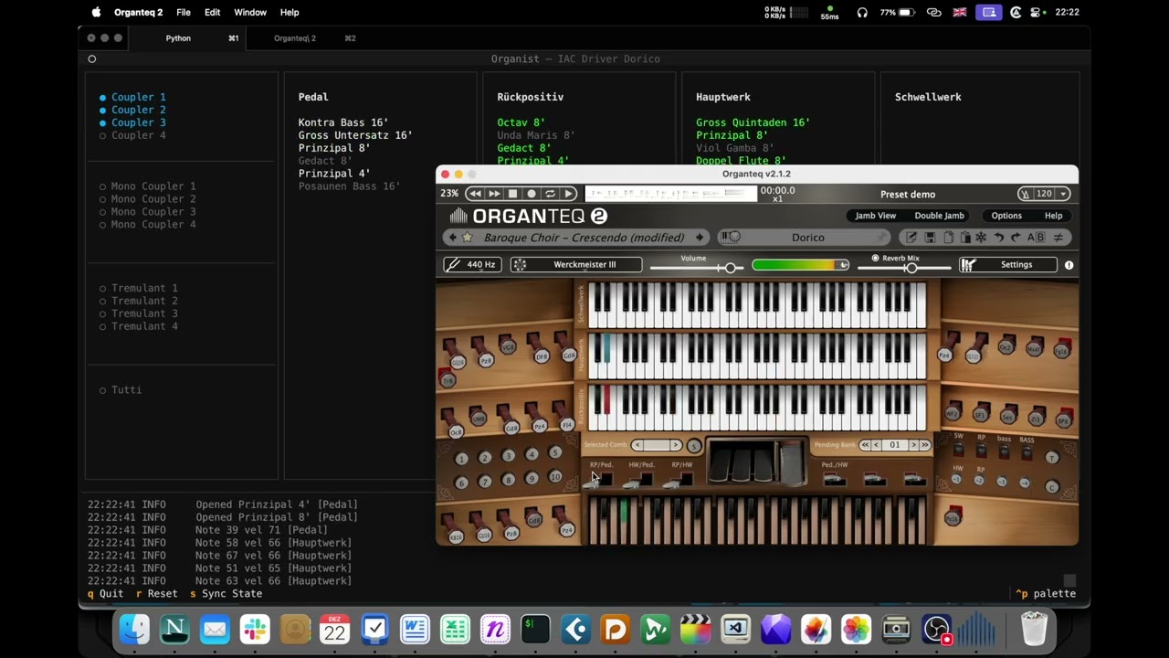 Now for the magic. The magic wouldn’t have happened if Organteq 2 didn’t have a full-fledged JSON-RPC API. I searched for documentation online but found nothing, and only later through trial and error simply navigated to http://127.0.0.1:8081/jsonrpc, where the documentation lay. Using this documentation I wrote a script in Python, which I subsequently called “Organist”, that listens to IAC Driver in macOS, through which it receives events from Dorico. Each stop is mapped to a separate CC. For instance, stop 1 is mapped to Prinzipal 32', the Prinzipal 4' stop to CC 16, and so on. Each technique, for example [+pz4], sends a value to the corresponding CC: if the stop needs to be opened, then 127, if closed - 1. Not 0, because Dorico generates noise during playback, sending zeros to various CCs, and if the script expected precisely 0, the stops would spontaneously close during playback of the composition. The other playback techniques, with the exception of combinations and general cancel, work analogously. Combinations work through program change, general cancel too: at the very beginning of composition playback the expression map has Init, which sends program change 0, and Organteq, receiving this, sees in its mapping preset that program change is linked to general cancel, and returns the organ to its initial state. For combinations it’s done analogously. The script listens to these events but doesn’t participate in them itself: it only updates the appearance when it hears program change 0, for instance, to perform a reset.