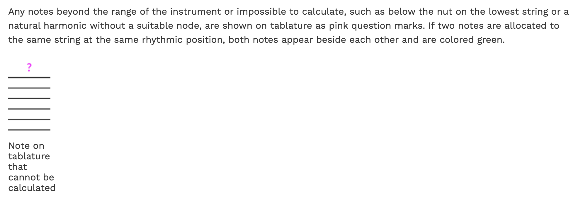 In working with TAB for mountain dulcimers, I get a lot of red question marks since Dorico cannot handle the mostly diatonic tuning with a couple of extra fret on some dulcimers labeled 6+ and 1+. These generate question marks in the custom tuning I have set; so I need to export parts into PDF and use a PDF editor’s Comment function to overwrite the question marks (which in my case are on, rather than below, the TAB-staff lines) using carefully sized Comment fields with no border and a white background.