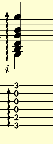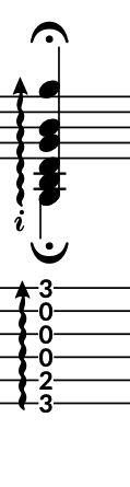 Upstem-voice (low to high) B, D, G, B, G, down-stem voice, (low) G = 6 strings.