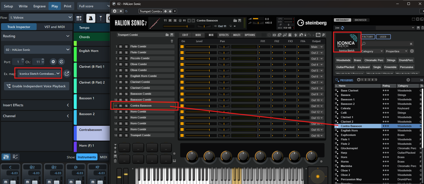 Dorico did let me change the expression map to the Iconica contra in play mode, it was on the list (exactly as on the left side of your screenshot). But then there were only random saxophone-like sounds coming from the contrabassoon, even when it had no notes in the score at all….