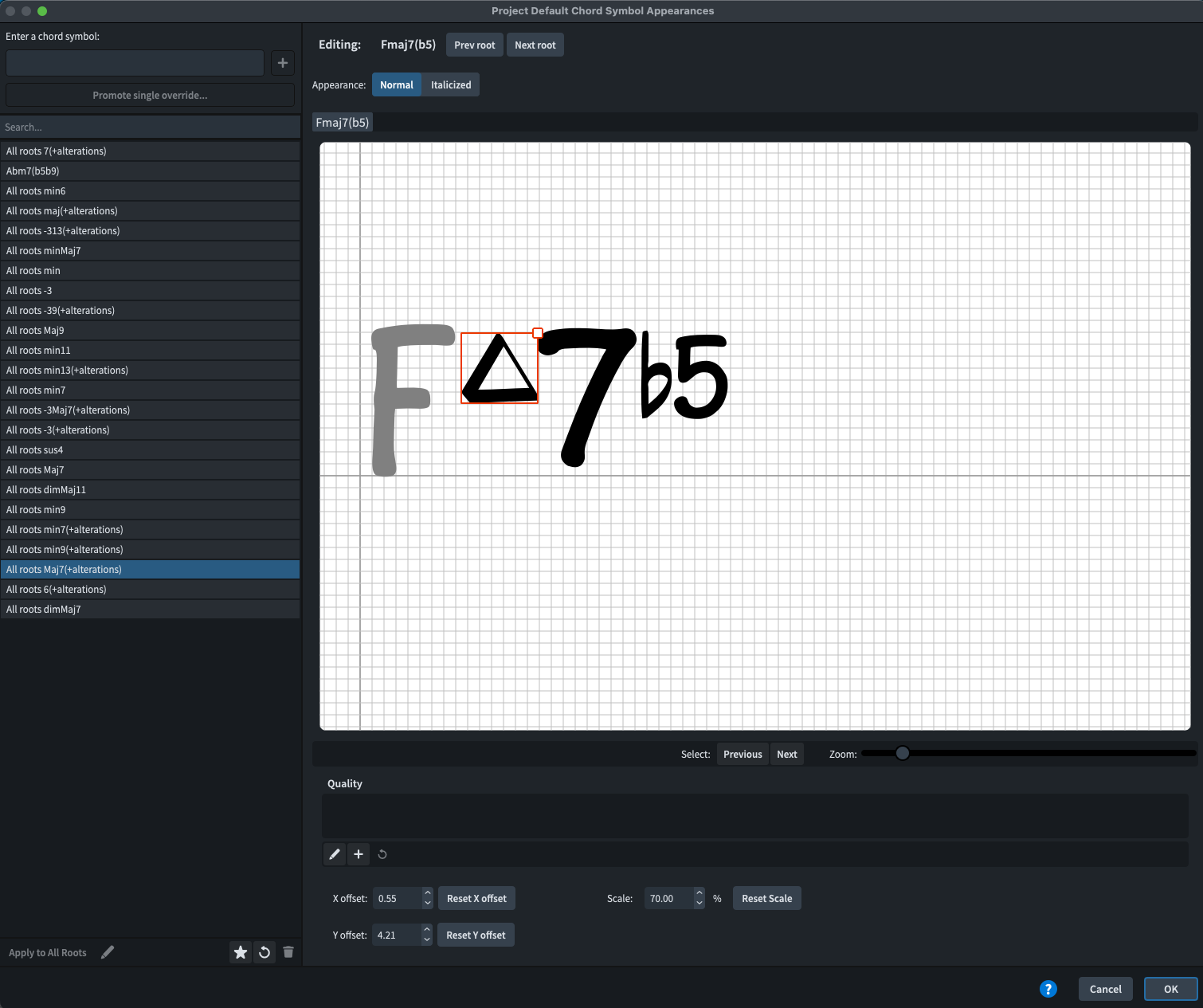 as I put in “maj7(#5)” without the Root I could edit for all roots , then I moved in every Root the triangle just a little and it seemed to work. So a message to the Developer, it seems to be a “Refreshing Problem” ( Model View Controller principals !!! ), I can program in Swift 6 myself and i made sometimes the same mistakes myself, if I am wrong please let me know,