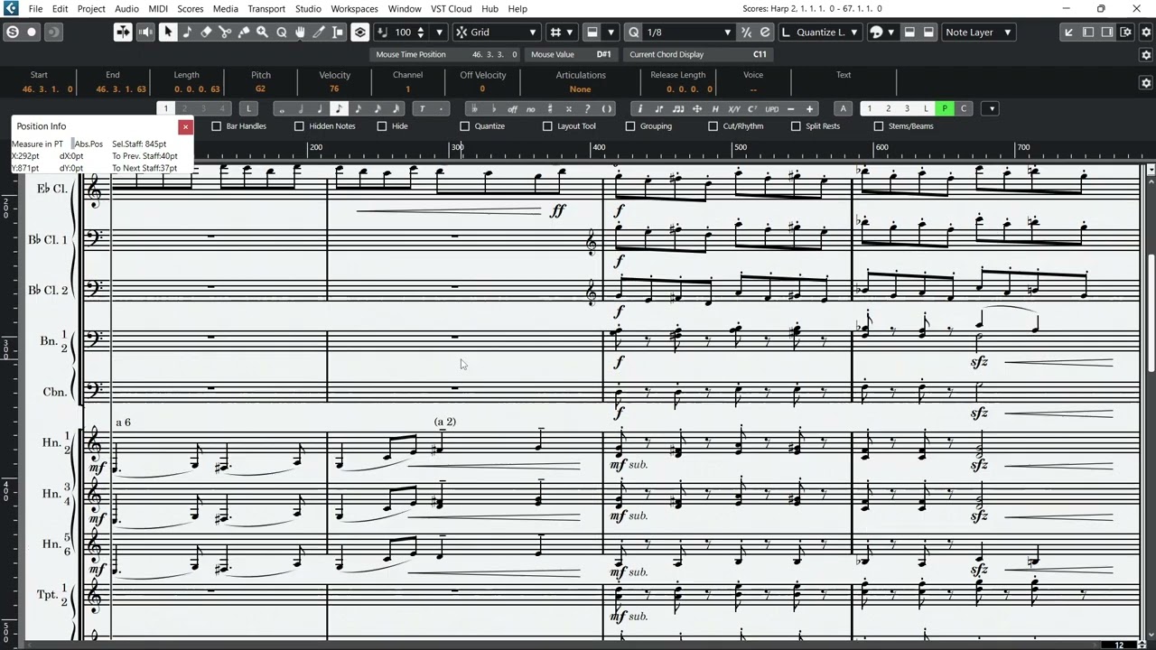 0:00 how can I have bars 2 and 4 NOT stretch due to the 32nd notes in the harp staff? I changed the notes type from Normal to Graphic, which fixed the spacing, but it seems not possible to group graphic notes. Any workarounds? I would prefer to not change the original notation.