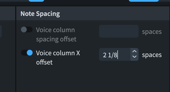I tried using the āVoice column X offsetā option and increased it to 1. Both voices moved.