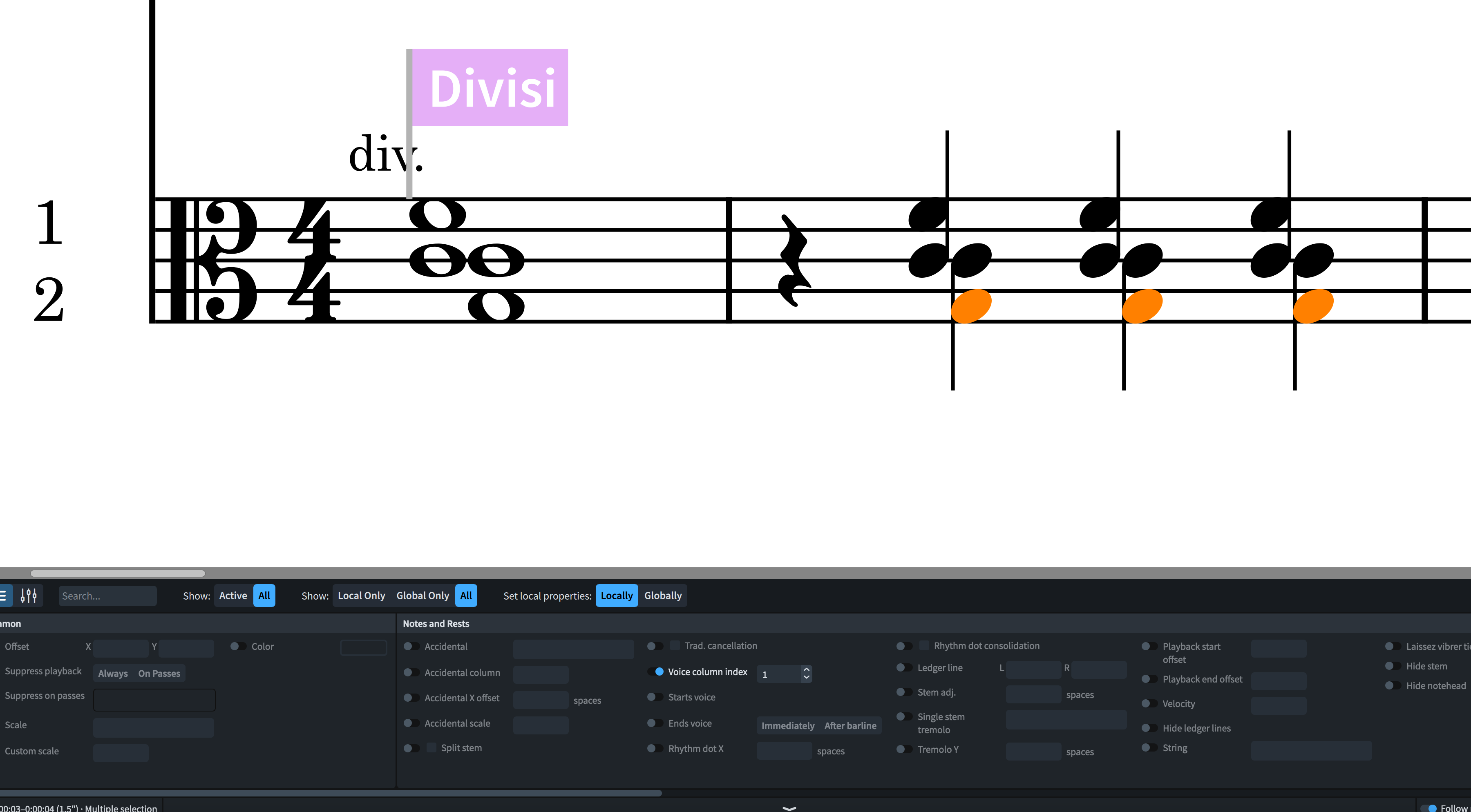 Hi @michaelstarobin, I donāt know if there are other (better) methods, but selecting the lower notes (in Engrave mode), and setting the Voice Column Index to 1, seems to give the desired result. (And now that you have different/separate voice column indexes, you can adjust your mentioned settings if necessary):