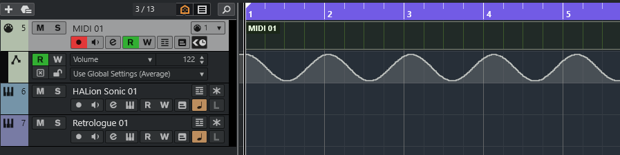 I show the Automation track of the MIDI Track and select Volume (it’s the default one). I draw the automation curve and play it back. I can see the Volume (MIDI CC7) slider on the Instrument is moving.