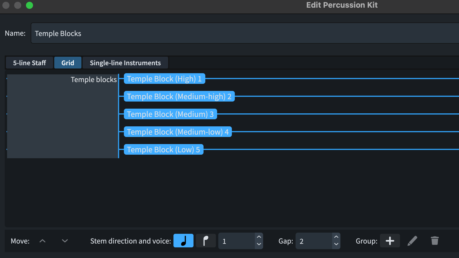 If that’s what you want, it’s even simpler. Library→Layout Options→Players→Percussion and select 5-line staff. Then you could have skipped the grouping. You could also change the gap to 1 on every temple block in the percussion editor under the grid tab if you want to keep the grid view for some reason.