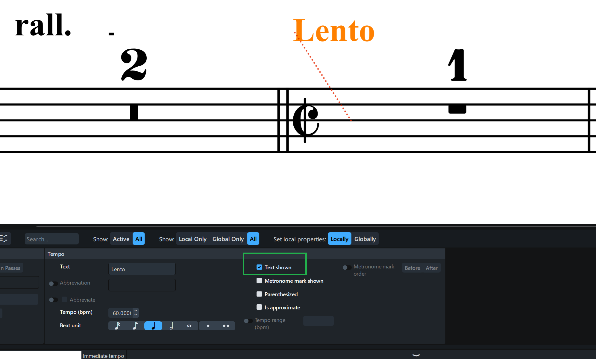 After setting it locally in the marked panel and unchecking “Text shown,” the tempo disappears in other part layouts as well. Is there a way to hide it only for the desired instrument? Must I write it only as staff attached text?