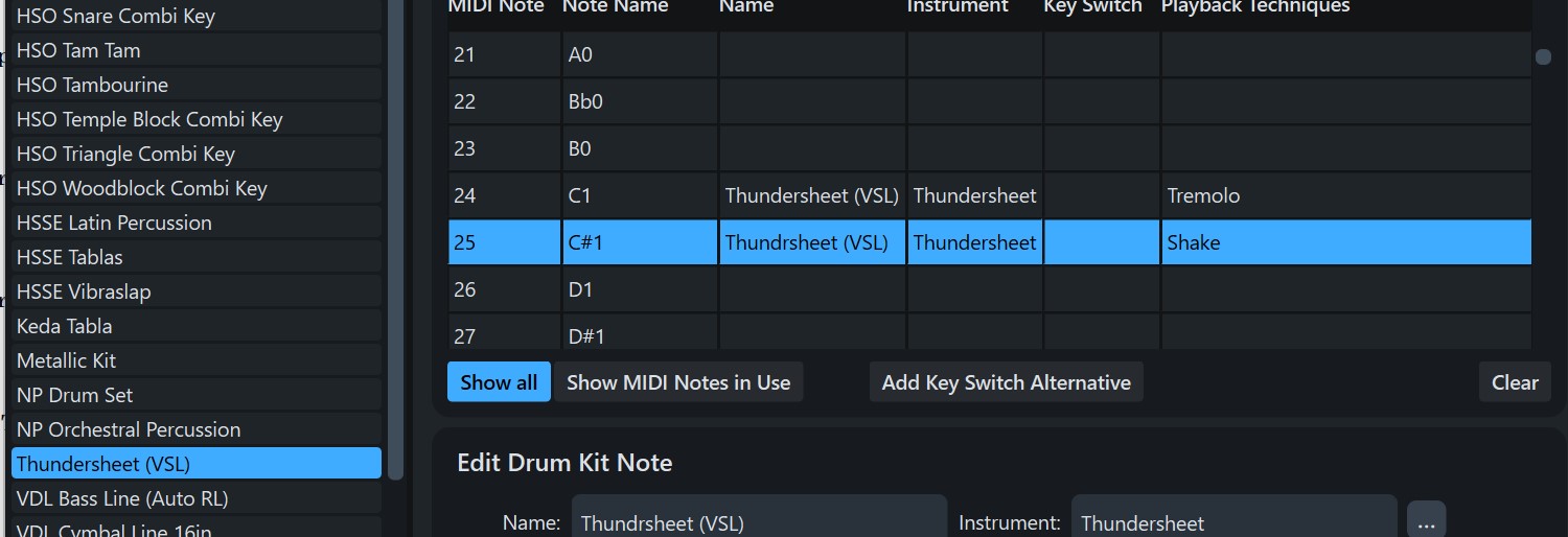 in the Synchron Player you can see which articulations are assigned to which midi notes, clicking on the little keyboard icon in the Synchron Player, to open the Key info Panel, where you find vertically specified the midi notes corresponding to the various articulations. In this example I opened SYNCHRONized Special Editions/Orchestral Percussion, and you see that the Thundersheet articulations start form C1 (Thundersheet Tremolo) and then C#1 (Thundersheet Shake forte)…etc…and so on till B1. (as seen in nr. 4 and 5)