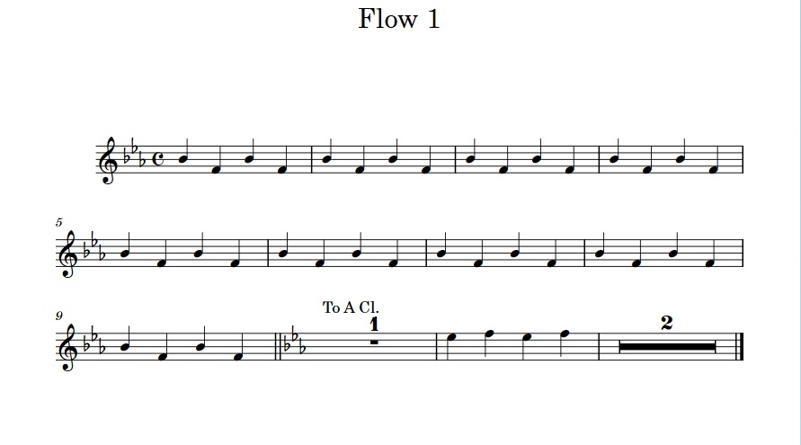 The only other detail was mentioned only once. It was a clarinet player who had to play in both A and Bb and he brought up a very subtle point. Dorico follows Gould’s convention that the key signature change which accompanies an instrument change should occur after the last note of the previous instrument. This makes abundant sense most of the time, however it will create more awkward readings when there is an intervening key change. Here is a non-musical mock of an instance where there is one empty measure before a key change during an instrument switch.