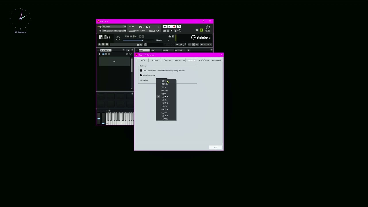 You can adjust the size of the user interface from -50% to +100% in 12.5% increments. This allows you to scale the UI on native 4K monitors for better readability, for example. When using HALion/HALion Sonic in Cubase/Nuendo, the available maximum and minimum scaling factors depend on the UI Scaling value that is set for the host application. For example, if UI Scaling is set to +50% in Cubase, the plug-in can only add a maximum of +50%.
