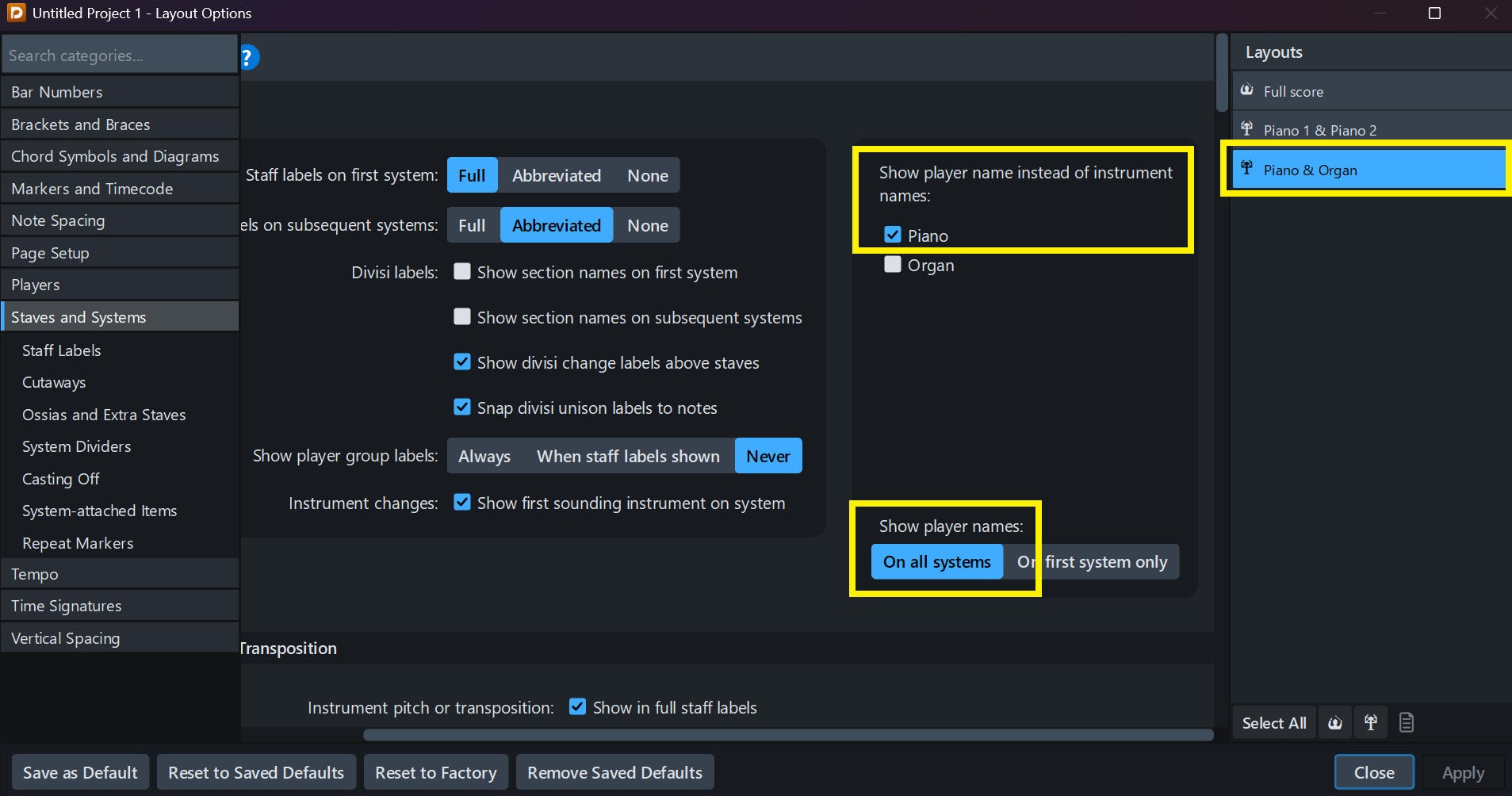 Then, in Layout Options, select the Piano+Organ Layout and choose Show Player Name instead of Instrument Name for the piano.