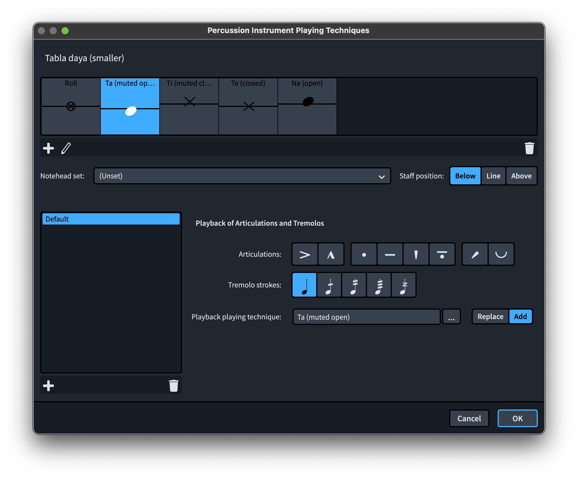 - When I go to Setup>Tabla Player>Edit Percussion Kit and choose each of the tabla drum’s Edit Percussion Playing Techniques, they have a total of 9 Playing Techniques (5 for Tabla Data & 4 for Tabla Baya). How do I access all of them in the score?