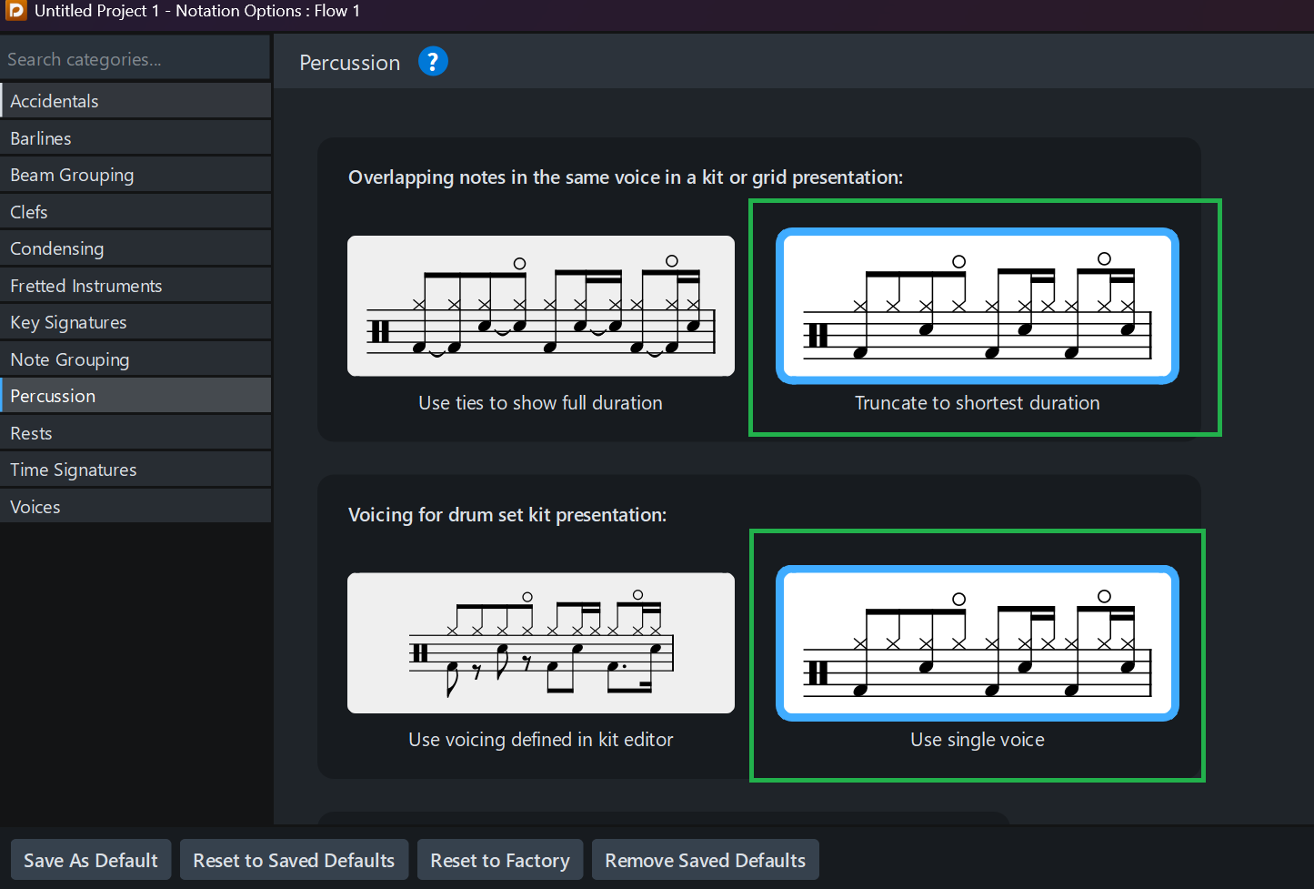 By adding a second snare (with stem up) one can put a half-note top-line note and snare roll in the same voice. In example 2, by flipping, adjusting the position offset to zero, and extending the stem of the top-line note one can seemingly combine the two. And adding an eighth note snare to the down-stem snare with a hidden note head and setting the offset position adjustment of that added headless eighth to zero one can eliminate the eighth rest halfway through the measure.