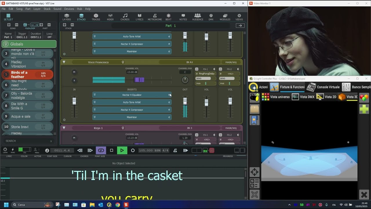 Some examples!! Lights, videos, lyrics teleprompter, backing tracks, effects automations, 6 inear mix, foh mix , everything and every band member pass thru VSTLive, no service company at all.