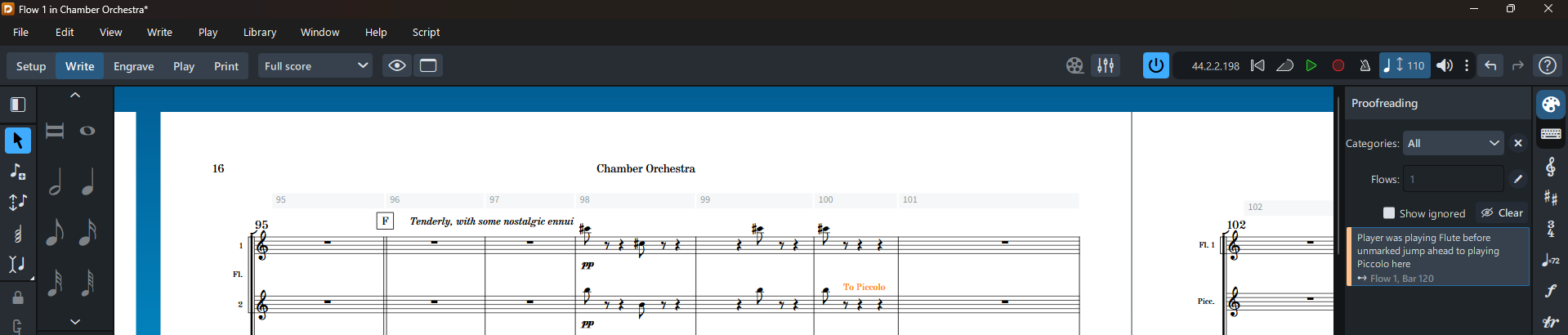 I got a proofreading mark that says, “Player was playing Flute before unmarked jump ahead to playing Piccolo here.” But it is marked. There’s a full 20 bar gap between them. It’s not unmarked at all. Is there something I’m not doing right?