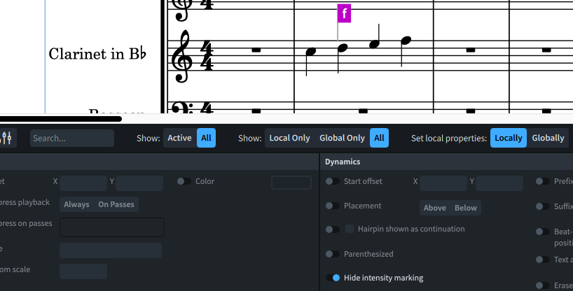 I’m working on a sextet where vertical space is very valuable in the full score. Dorico has this great feature where you can locally hide items so they appear in the parts (or other scores), but for example not in the full score, and automatically adjusts the spacing. What completely baffles me is why Dorico allows me to this with some items (like playing techniques), and not others (like dynamics or slurs *edit: gradual dynamics). It’s terribly annoying to have to move those items outside of the page, or to make them 100% transparant (the spacing doesn’t adjust then), or to change them to 1% scaling (which then still prints some small streaks). Am I missing something?